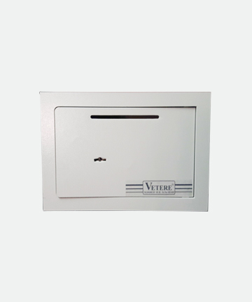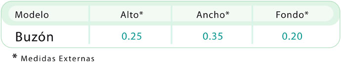 Buzon construido en chapa de 1.5 mm de casco y una puerta de 5 mm de espesor. Ranura de 120 mm x 5 mm de largo con sistema antipesca.